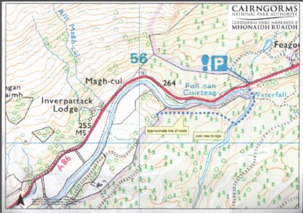 Rather than cross the bridge at Gallovie and on to a notoriously dangerous stretch of the A86, walkers and off-road cyclists can now follow a track on the south side of the river Pattack, through the new gate in the deer fence, then down to the A86 by the Lower Pattack Falls.