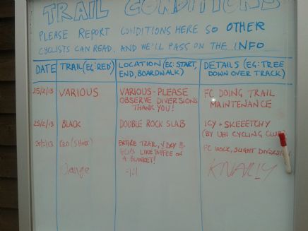 The board is equipped with a marker to allow staff and visitors to note any work or diversions on the trails, and general trail conditions.